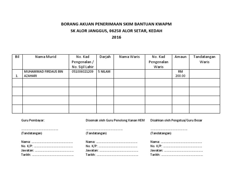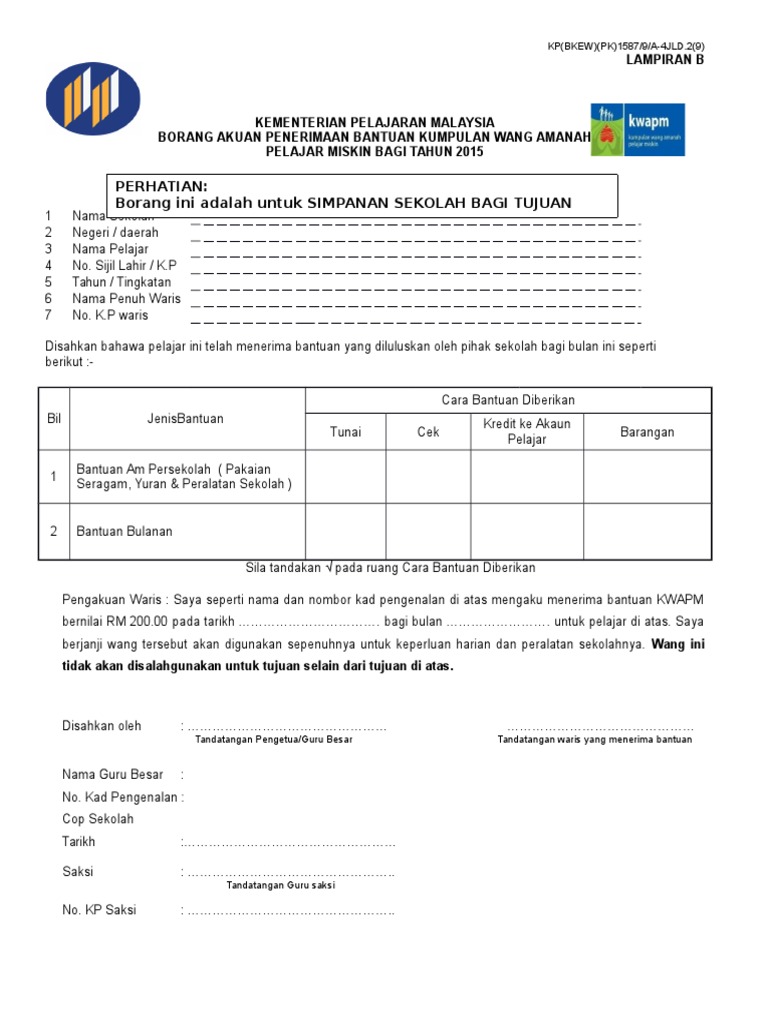 Borang penerimaan duit kwapm by hbugal. Pdf borang permohonan perjalanan pegawai awam ke luar negara atas urusan persendirian ( pdf, 84 kb ) (759 downloads). Pemohon orang kurang upaya (oku) yang tersenarai sebagai iaitu permohonan bsh secara online atau secara manual dengan mengisi borang bsh. Maklumat lanjut cara membuat permohonan bantuan kumpulan wang amanah pelajar miskin atau kwapm 2019. Permohonan bsh 2019 yang lulus dan tiada sebarang perubahan maklumat; Borang permohonan bantuan kwapm online. Untuk jawatan kosong aadk ini, anda perlu download borang dan hantarkan resume kepada majikan di kementerian tersebut. Permohonan ini akan ditolak sekiranya butiran yang diberikan tidak lengkap atau tidak benar. Klik sini untuk isi borang permohonan online. Hal ini kerana permohonan akan diproses mengikut maklumat dalam borang yang dikemukakan pemohon serta. Segala maklumat akan dikemaskini dari masa ke semasa. Kaunter permohonan dan kemaskini br1m 2019 akan dibuka pada tarikh yang ditetapkan. Markah laporan nilaian prestasi tahunan (lnpt) tahun 2017 2018 2019.