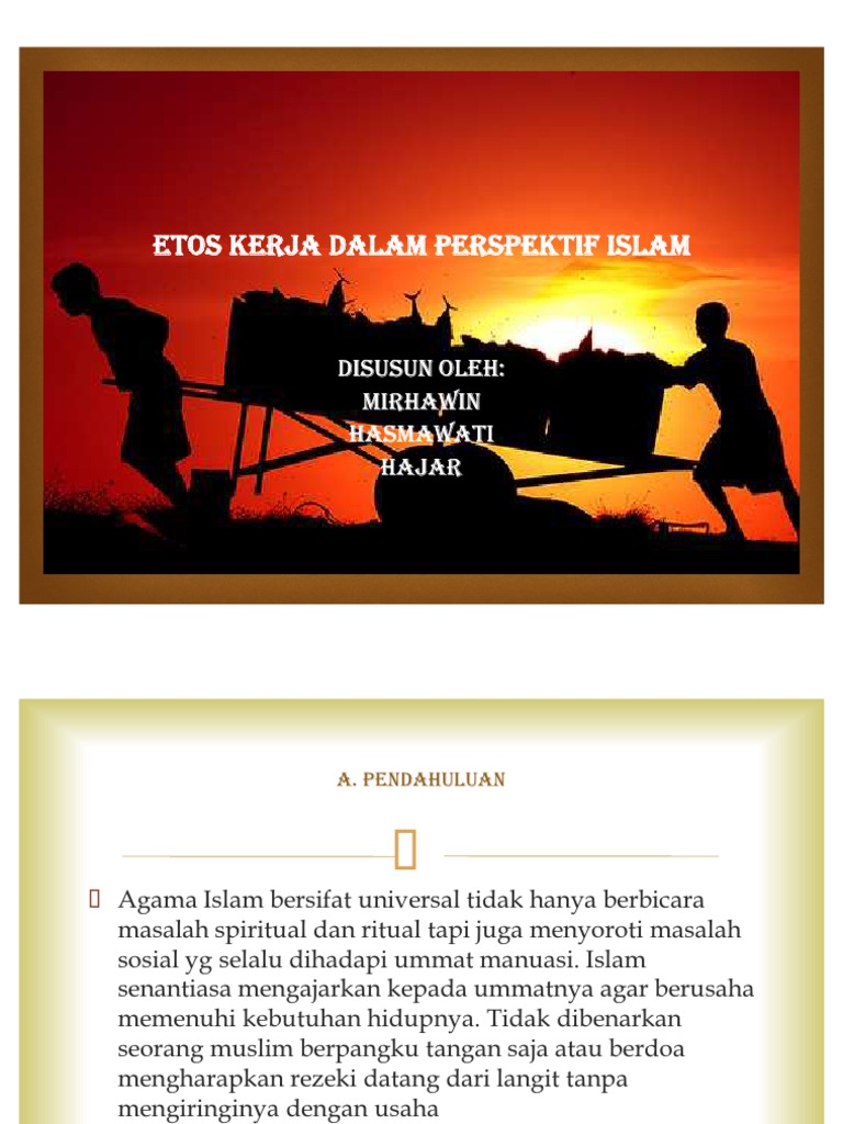Pengertian etikaistilah etika berasal dari bahasa yunani kuno. Etika kerja dalam islam (cont'd.) berikutadalahetikapokokdankualitas yang diajarkan islam padaumatnya, yaitu: Bentuk tunggal kata etika yaitu ethos sedangkan sedangkan kata etika dalam kamus besar bahasa indonesia yang baru (departemen pendidikan dan kebudayaan, 1988 mengutip dari bertens. Di dalam hal ini, islam telah mencadangkan supaya dihidupkan. Fathonah islam juga mengatur tentang etika kerja yang menjadikan kerja itu bukan hanya sebagai mencari rezeki akan tetapi lebih dari mencari identitas kemanusiaan itu sendiri.