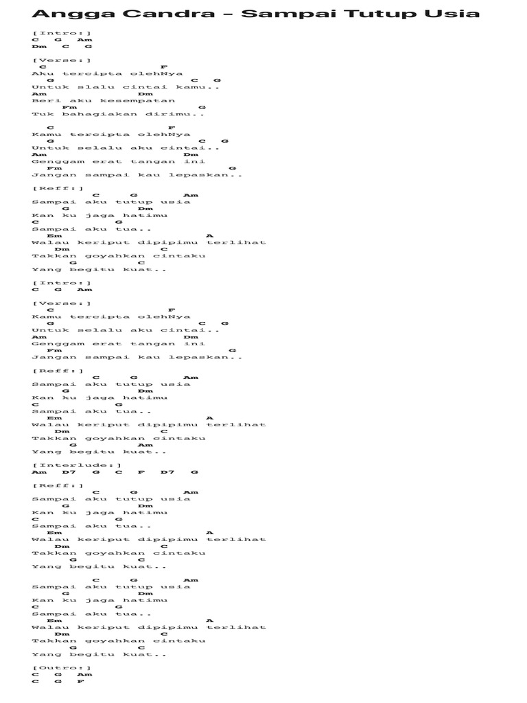 Sampai aku tutup usia g dm kan ku jaga hatimu c g sampai aku tua ~ em a walau keriput dipipimu terlihat dm c takkan goyahkan cintaku g (c) yang begitu kuat ~ outro :