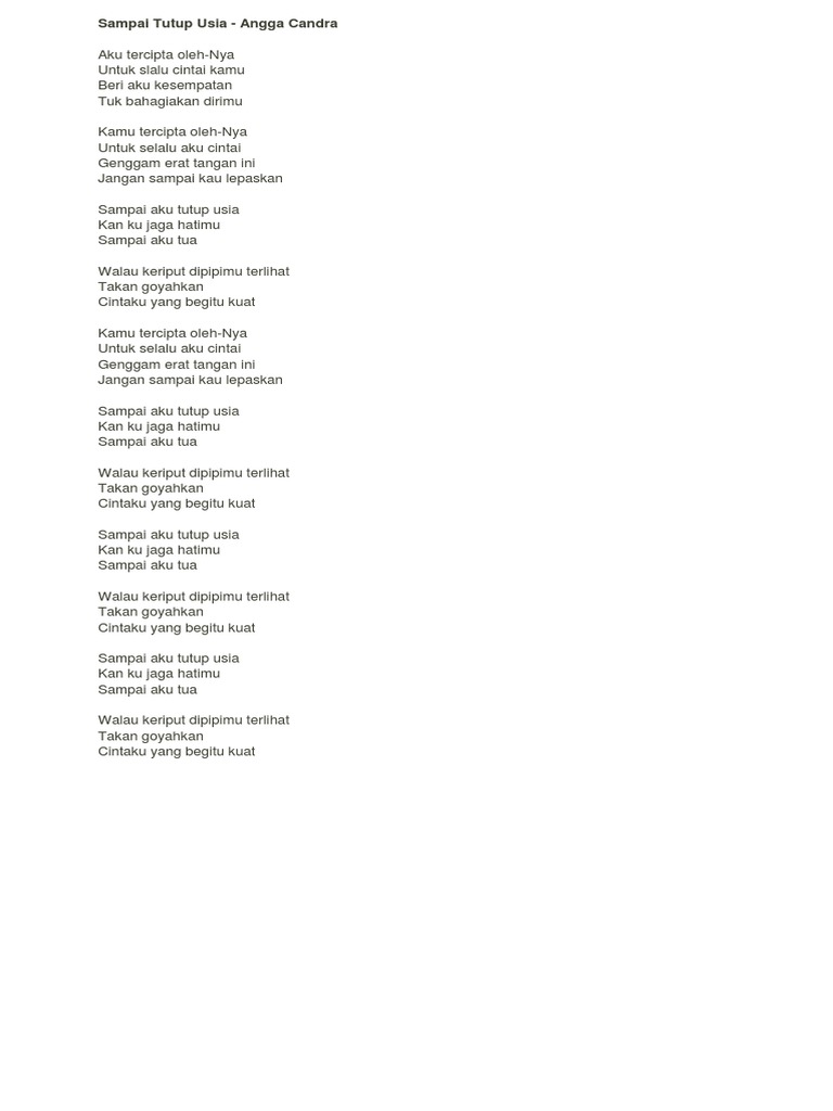 Walau keriput di pipimu terlihat. Sampai aku tutup usia g dm kan ku jaga hatimu c g sampai aku tua ~ em a walau keriput dipipimu terlihat dm c takkan goyahkan cintaku g (c) yang begitu kuat ~ outro : C g/b am ~ c g/b f ~ tags. Walau keriput di pipimu terlihat. 199 views, added to favorites 3 times. Kan ku jaga hatimu sampai aku tua. Lagu sampai tutup usia merupakan lagu yang dipopulerkan oleh angga candra. Kan ku jaga hatimu sampai aku tua. Sampai aku tutup usia kan ku jaga hatimu sampai aku tua walau keriput dipipimu terlihat takan goyahkan cintaku yang begitu kuat. Kan ku jaga hatimu sampai aku tua. Last edit on aug 13, 2020. E a d g b e. C g/b am ~ c g/b f ~ tags.