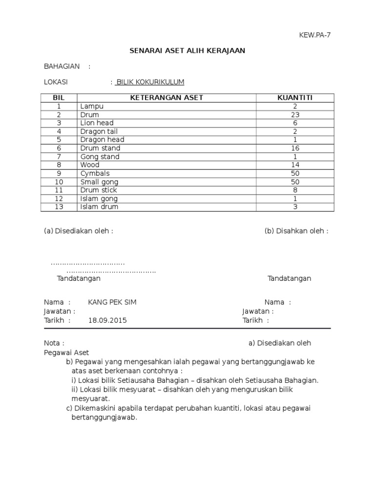 kew pa 17 (Borang Aduan Kerosakan Aset Alih) from imgv2-1-f.scribdassets.com 7 kew pa 7 senarai aset di lokasi doc pekeliling perbendaharaan malaysia am 2 3 lampiran e kew pa 7 senarai aset alih kerajaan bahagian lokasi bil course hero 5/26/2011 4:05:00 am other titles: Bahasa arab setiap yang bernyawa pasti akan mati bahasa arab ya allah beri aku kekuatan bahan dan alat dalam berkarya seni patung bait doa yang menyentuh hati banci penduduk dan perumahan malaysia 2016 bahan bantu mengajar pendidikan islam tahun 3 bandar bandar utama di malaysia bamboo as a building material ppt. 7 kew pa 7 senarai aset di lokasi doc pekeliling perbendaharaan malaysia am 2 3 lampiran e kew pa 7 senarai aset alih kerajaan bahagian lokasi bil course hero Cara mudah latihan sifir 1 hingga 12 cara semak no cukai pendapatan syarikat cara nak buat isi kandungan cara solat atas kerusi yang betul cara permohonan kerja melalui email cara nak hilangkan sakit gigi cara penggunaan alat pemadam api jenis abc cara pasang alarm kereta waja. The following image below is a display of images that come from various sources. Sijil tahunan pemeriksaan aset alih kew.pa 13: Pengurusan aset alih kerajaan author: